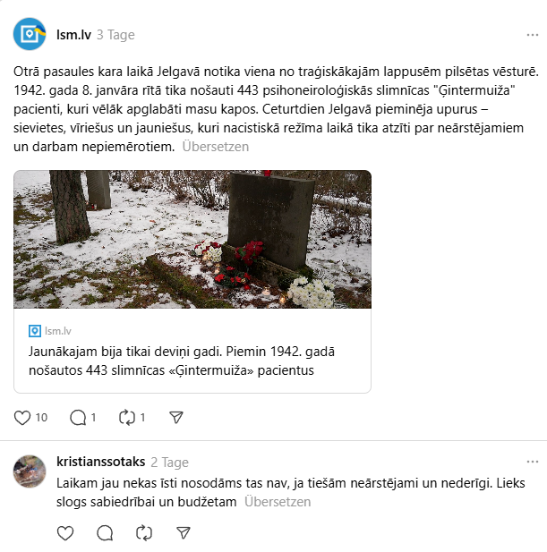Diese moralische Verpflichtung sind keine leeren Worte in einer Zeit, in der öffentlich im Geist von gestern kommentiert werden darf. Thread.com veröffentlichte am 10. Januar 2026 unter einer Notiz des ÖRR-Info-Portals LSM zum Thema folgenden Kommentar von „kristians sotaks“: „Es ist vielleicht nichts wirklich Verwerfliches daran, wenn sie tatsächlich unheilbar und unbrauchbar sind. Eine unnütze Last für Gesellschaft und Budget.“ Ist das ernst gemeint oder provozierende Satire?