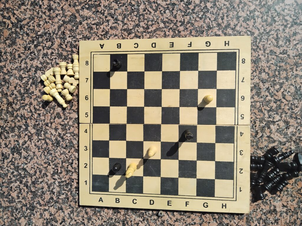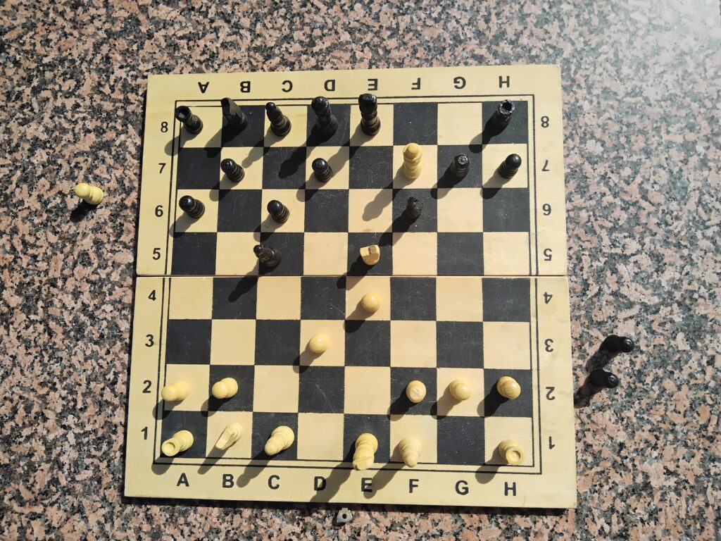 Und selten bleibt viel von den Streitkräften übrig, die beiden Kriegsparteien sind am Boden zerstört bis einer den König gefangen nimmt. Nur ausnahmsweise wird der König zu Beginn oder in der Mitte des Spieles gefangen gesetzt, dies ist sozusagen die höhere Kunst der Diplomatie!